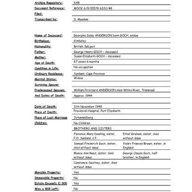 Died 17 May 1922, Vanwyksvlei,Carnarvon, Cape Colony.