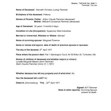 FLEMMER Kenneth Christian Ludvig - died 6 Apr 1971