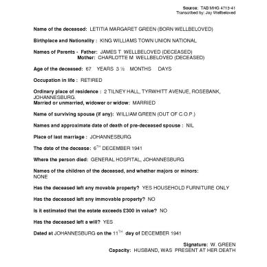 Born abt 1920 Brandfort OFS, died 6 Mar 1945 Far East Rand Hospital Springs Transvaal. Age 25yrs 5mths.