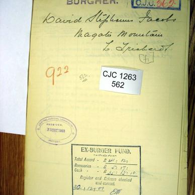 Born in Smithfield, abt 1865. Age 37yrs. Sent away to Kaffirskraal, and tried for High Treason. Spouse Catharina...