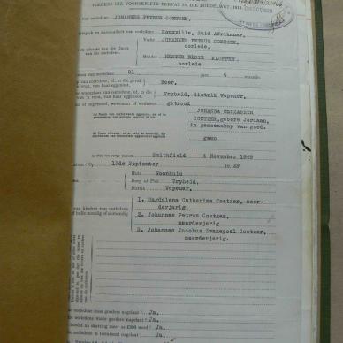COETZER Johannes Petrus died 12 September 1929
